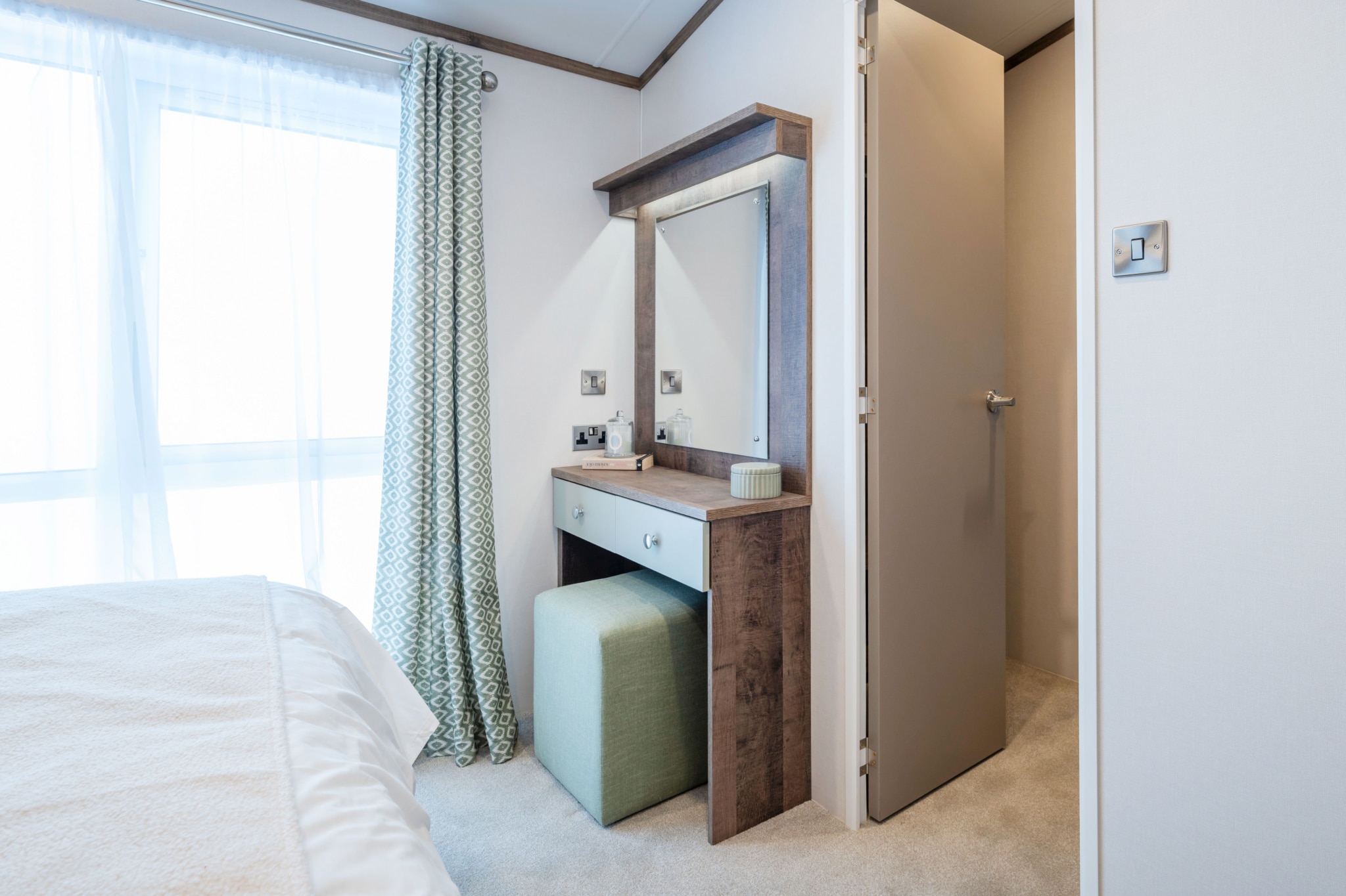 Externally it is striking, with a two-tone CanExel exterior, a stepped front and French doors to the front elevation letting light flood in.  Vaulted throughout, it feels wonderfully spacious, and there’s plenty of storage space, particularly in the kitchen, bedrooms and bathrooms, which also have plenty of visual wow factor built-in!