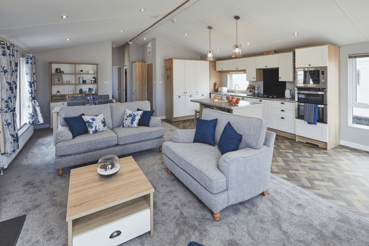 With a proper three-piece suite arranged around a cosy, modern electric fire, the Pinehurst’s lounge is perfect for entertaining friends and family. Naturally, there’s a media unit for your TV and plenty of storage space for your bits and bobs. You’ll love digging your toes into the thick carpet, too. And with a lovely calming blue and grey colour scheme set off by light wood furniture, you’ll have no trouble relaxing.